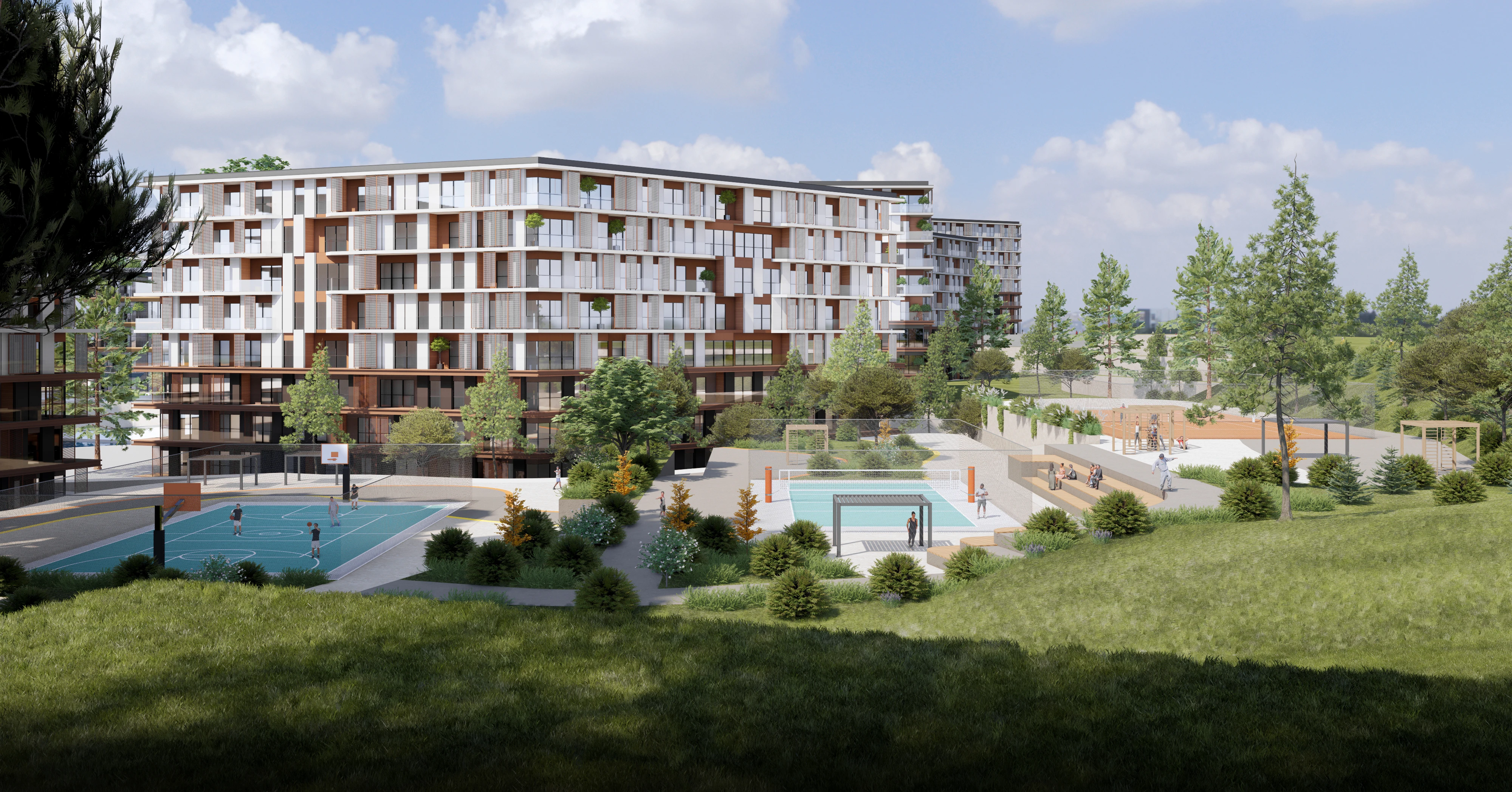 In addition to passive recreational spaces, the design also includes dedicated sports facilities, such as a tennis court and other active zones. These spaces are positioned to maintain a balance between active and quiet areas, ensuring that the landscape accommodates a wide range of activities without compromising the sense of calm and relaxation established by the lagoon and green areas.